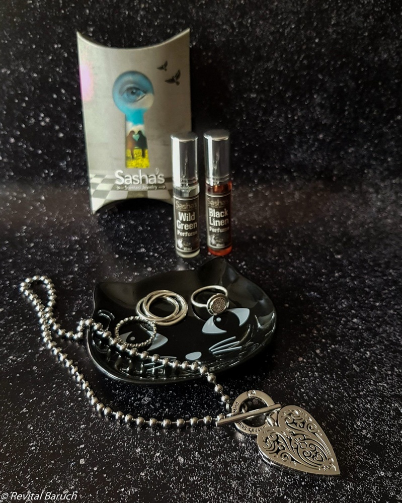 כל תליון מגיע עם בקבוקון בושם אחד לבחירה מתוך שני ניחוחות בושם שונים, שנרקחו במיוחד עבור Sasha's state of mind בדרום צרפת, בשיתוף עם לא אחרת מאשר מומחית הבישום: גליה תורן חן.